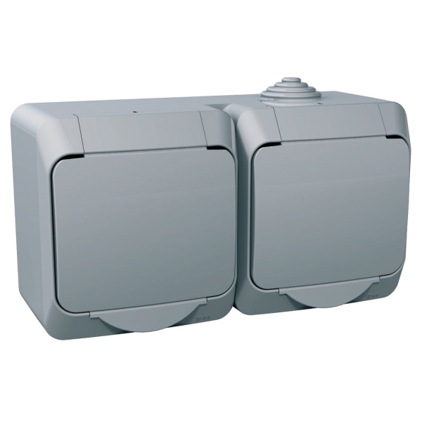 Nadžbukna kombinacija dviju šuko priključnica (utičnica) s poklopcem u zajedničkom sivom IP44 kućištu