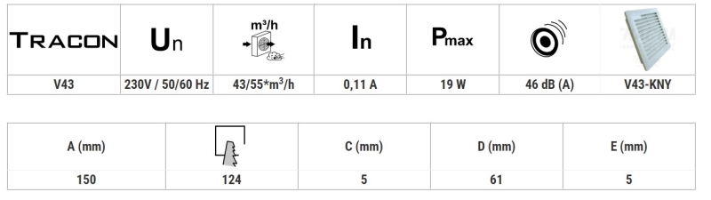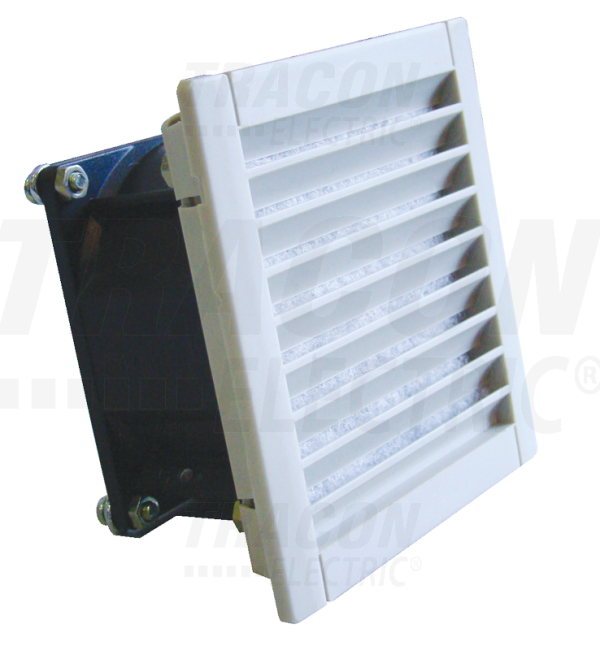 Opis: ventilator za industrijsku primjenu, osobito u razvodnim ormarima, serverskim prostorijama, te na mjestima gdje je za rad ugrađenih aparata neophodno redovito prozračivanje. Montiranje se može izvesti na jednostavan i brz način, bez vijaka, samo pomoću ušica za pričvršćivanje. Ventilatori i izlazni otvori za zrak su tvornički opremljeni tankim filtarskim umetcima koji imaju funkciju da sprječavaju ulazak kišnih kapi i čestica prašine većih od 10 mikrona, čime se postiže stupanj zaštite IP54. Smjer strujanja zraka može se mijenjati po potrebi okretanjem ventilatora. Ventilatore za prozračivanje svrhovito je smjestiti u donju trećinu razvodnog ormara i treba ih primjenjivati uvijek zajedno s izlaznim otvorom (i filtrom), a pomoću termostata može se postići u sustavu automatizirano prozračivanje.